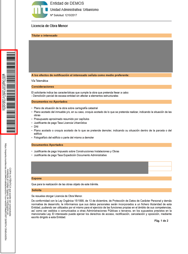 Este código de seguridad lo podemos encontrar en el margen izquierdo, por ejemplo, de todos los documentos que genera esta plataforma o documentos firmados electrónicamente.